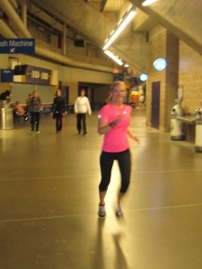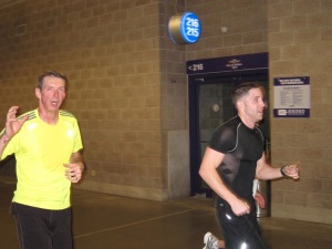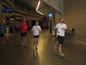 I was quite surprised to learn that these runners are actually doing laps around the concourse at the dome, i.e. the area where spectactors wander around purchasing foot-long hotdogs and beers…not quite as fun as I had imagined.