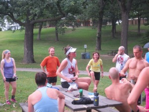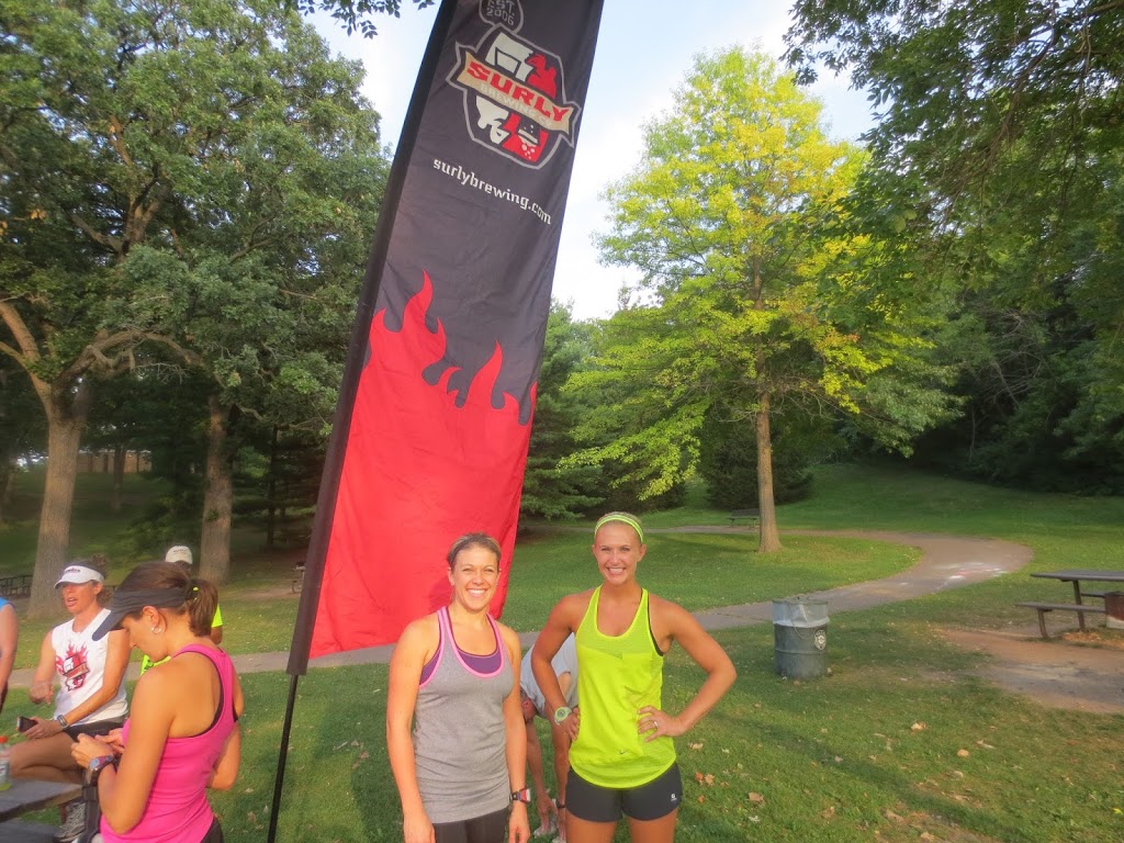My friend Kelly had also signed up, so the two of us carpooled over to Theodore Wirth Park. It was a steamy 95 degree night, and the bugs were also out in full force. We found the gathering spot by the Surly flag, and chatted with the other runners while we waited to start.