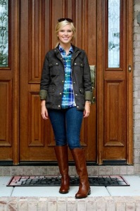 Emily from the “Life with Emily” style blog listed the JCrew fieldjacket as one of her fall essentials, and she paired it with a bright plaid top, jeans, and boots for a quintessential fall ensemble.