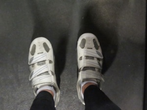 The studio was very cool. They had some funky and fun spin clothes for sale, and a colorful board with the week’s schedule of classes. The person who checked us in explained how it all worked. We had little cubbies with numbers that matched our bike numbers, and in the cubbies were bike shoes in our size (We had entered our shoe size online when we registered).