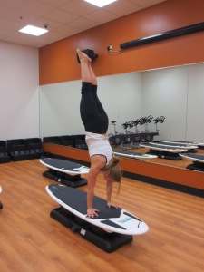 She said that after a month of teaching classes, she has progressed to removing one of the stability straps on her board, and even more impressive…she can do a headstand on one!