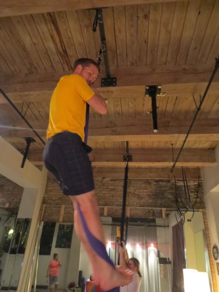 The biggest challenge for me was just swinging my feet over my head into the pike! I just did not have the core strength to do it, and I always needed assistance. However, Dustin, who apparently may have a future in the circus, had no problems at all getting into the pike position! The biggest challenge for him was pointing his toes and trying to be graceful, ha! But seriously, he must have a much stronger core than me, even though I am the one who does all this yoga and barre. What the heck? All he really does for strength is rock climbing, but apparently, that is enough, because he was able to do nearly every move she demonstrated, and I was the one who struggled!