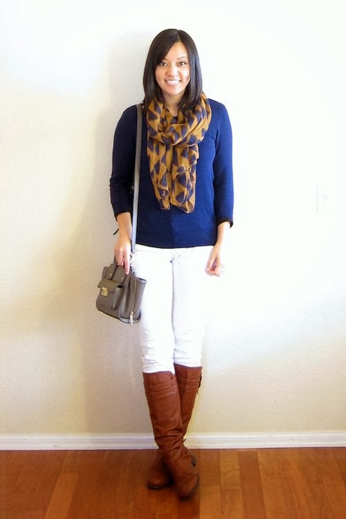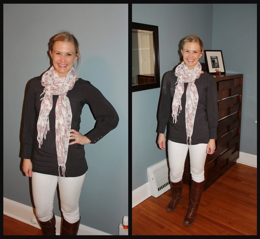 She paired hers with a navy top and a winter colored scarf. I tried for a similar look for work last week. I paired my JCrew ankle jeans (similar HERE on sale for $59.99) with a gray tunic from Len Druskin (from a few years ago), and a white and gray scarf from Target (similar HERE)