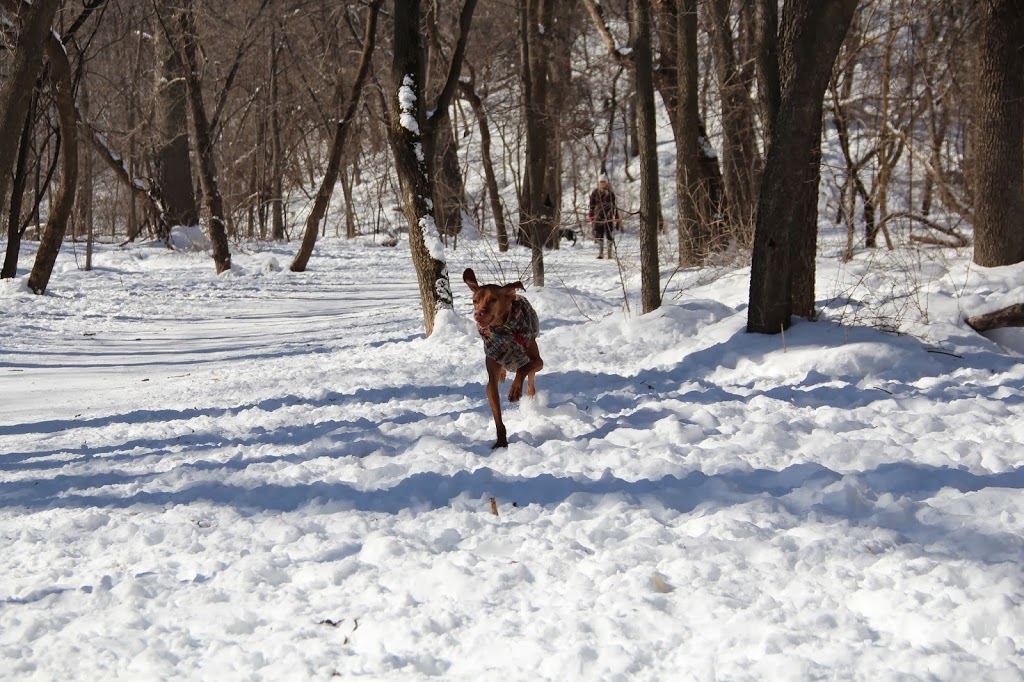 I may complain a lot about the Minnesota winter this year, but its not ALL bad. In fact, on Sunday, after returning from Anandale (where I was for all the bachelorette fun) Dustin and I took Matilda to the Minnehaha dog park….Yes, she is wearing a cowl neck sweater. The Right Fit in dog fashion?