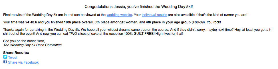 Even better, we received “official” results emails within an hour of finishing. And we could tweet or post our results to Facebook with a quick click of a button!
