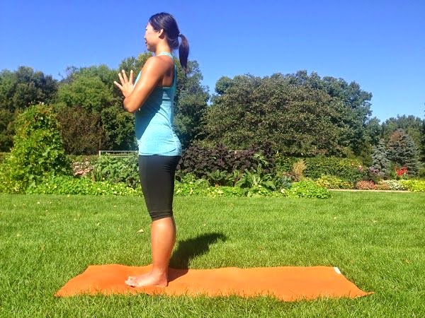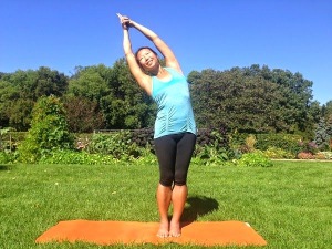 5. Standing Half Moon pose. Stand tall on your feet, legs together. Reach your arms up, interlace your fingers with your index fingers pointing up. Firm through your feet as you inhale, point and stretch straight up. Then exhale as you reach up and over to the side (as if you’re going over a big beach ball). Feel as if you’re between two panes of glass. Biceps by ears. If you feel your shoulder on top roll forward, gently roll it back. Feel side body stretch and and open chest. This feels great after all the hunching forward that happens when running or at a desk job. This pose expands your chest and shoulders, strengthens ankles and increases hip mobility. Do not do this if you have hip or back pain.