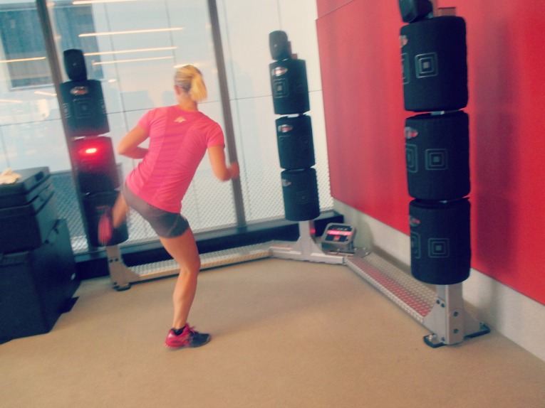It was set to go for 45 second intervals where a beep and a light would flash on one of the three pads on one of the levels (bottom, middle, top). Wherever it beeped and flashed, you would have to kick it right on the light as quickly as possible. It was supposed to help with agility. I did a few intervals and could definitely see how it would be a good workout!