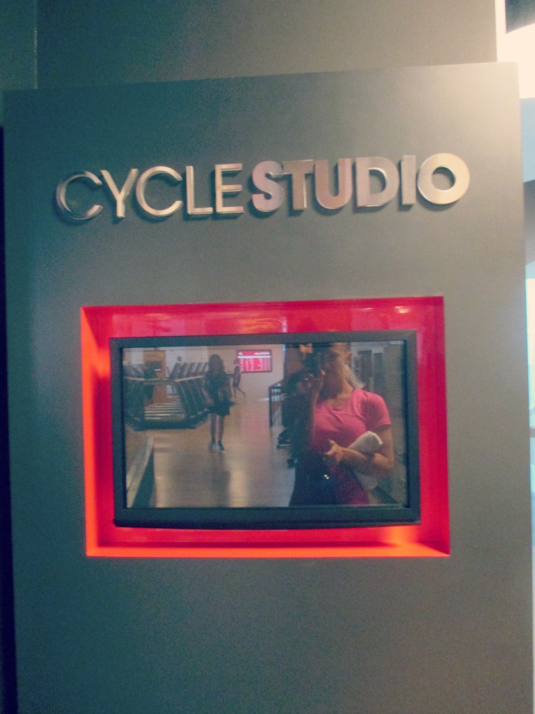 We grabbed towels and headed to the spin room to set up our bikes. The spin studio was quite nice, with the teacher up front on a platform and a wall size TV screen behind her.