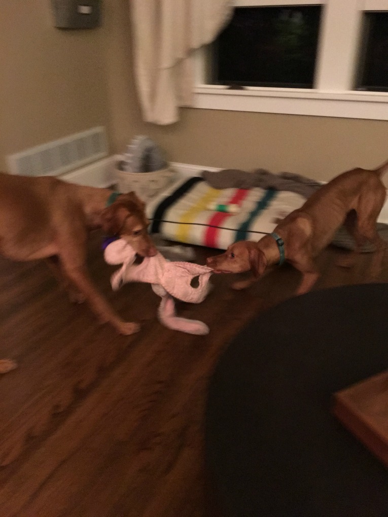 By the way, Matilda stayed with our friends with the vizsla puppy Scarlet (who we have dog-sat in the past). They kept us updated on the dogs’ shenanigans. Matilda had a really fun weekend; she’s now passed out on the couch from all the fun!