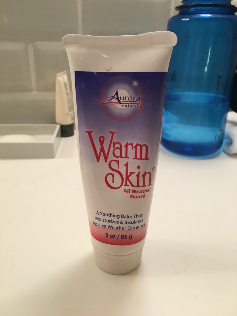 I wore Craft tights, an old lululemon base layer, an old lululemon jacket, a gaitor, hat, snowboarding socks, and Craft gloves. I also put some of this “Warm Skin” protectant on my face before the run, which seemed to help.