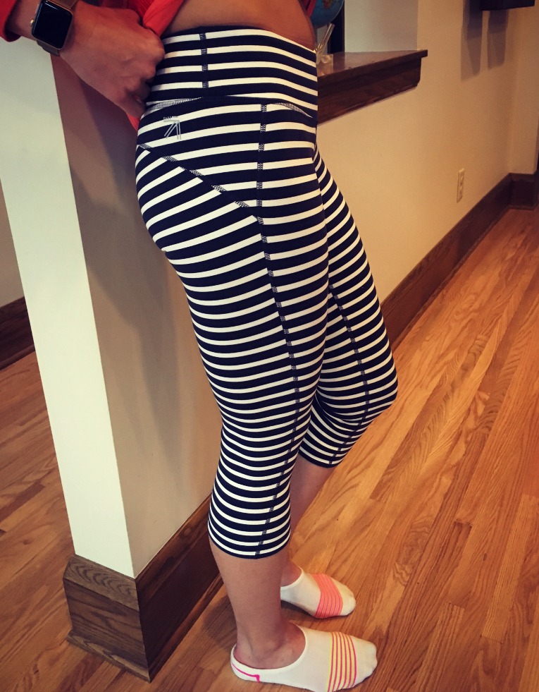 Sunday: [solidcore] class, no running. I wore this new pair of New Balance/JCrew striped capris (on sale right now!). I think they are my new favorites! Dark navy and white striped, 3/4 length, thick quality material. Highly recommend!