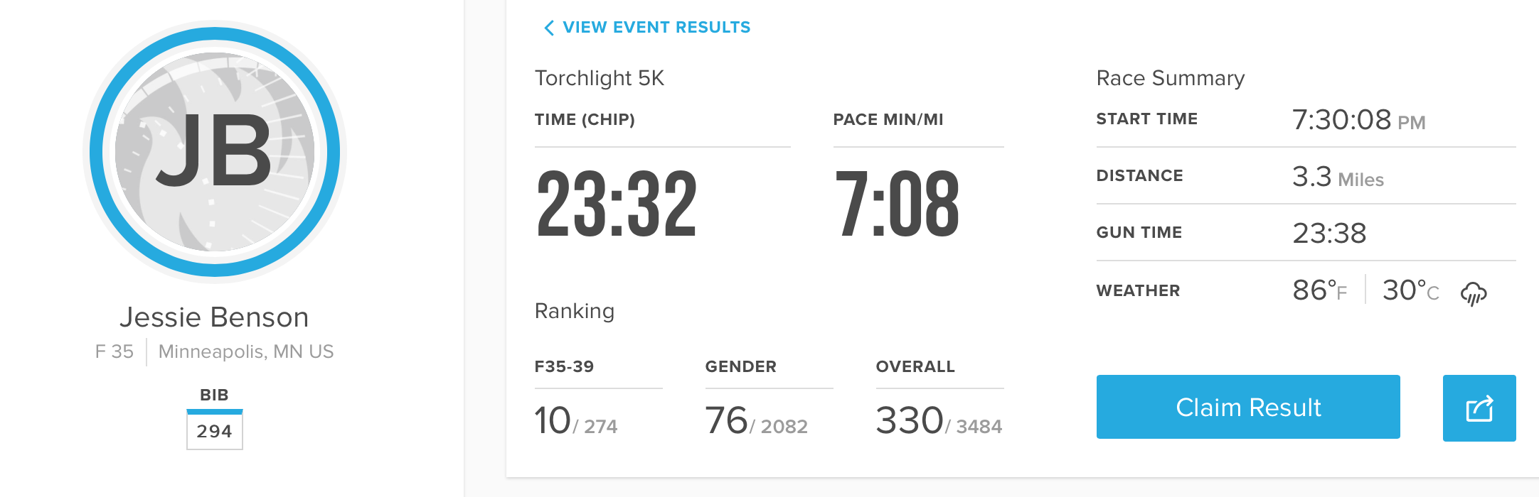 Well, to be honest, I actually snuck in a solidcore class before work, which I know isn’t the smartest thing to do before a 5k race in the evening, but I knew I wouldn’t be doing a lot of classes for the next 5 weeks, so I wanted to fit in as much strength as I could. I wasn’t planning to go for a PR at the Torchlight anyways, as it’s always so dang hot for this race!