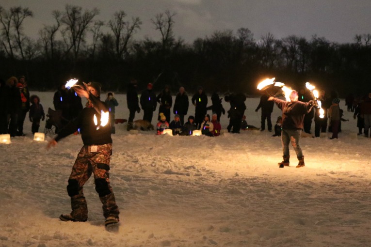 The Luminary Loppet was beautiful- there were ice sculptures, all kinds of candles/luminaries, fire dancers, and even an ice instrument band! Participants can cross country ski, snowshoe, or walk. We just walked, but we really needed our snowshoes due to all the snow we received earlier in the day.
