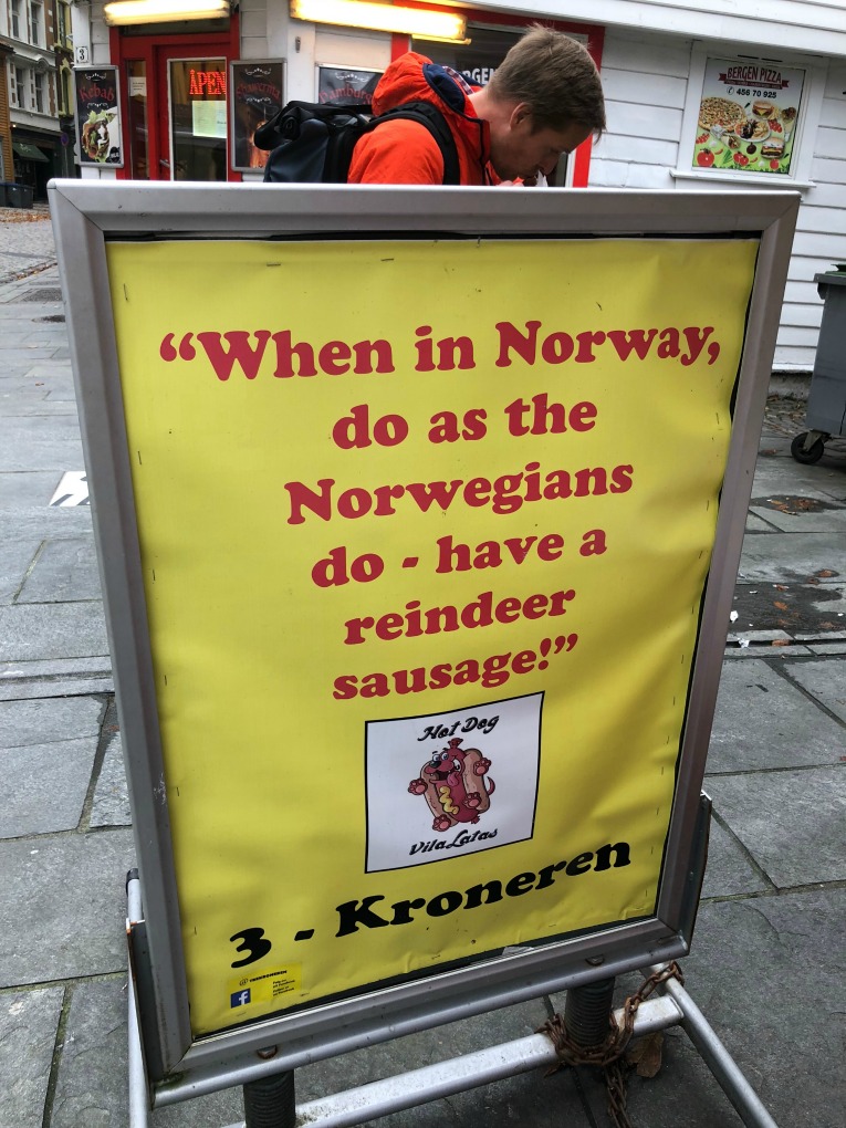 Both Rick Steves and our friends Julie and Mike had recommend that we make a stop at Treknoneraen for a reindeer sausage, served with lingonberries and fried onions. Pretty tasty!