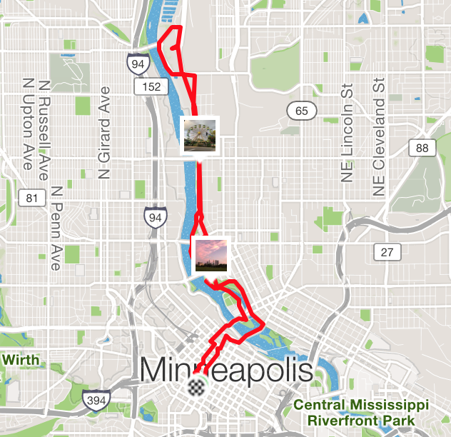 I was on a trail, but then somehow I ended up on a road with no shoulder and no sidewalk. I tried to speed through that section to find the trail again; I could see the downtown skyline and knew I just needed to head that direction!