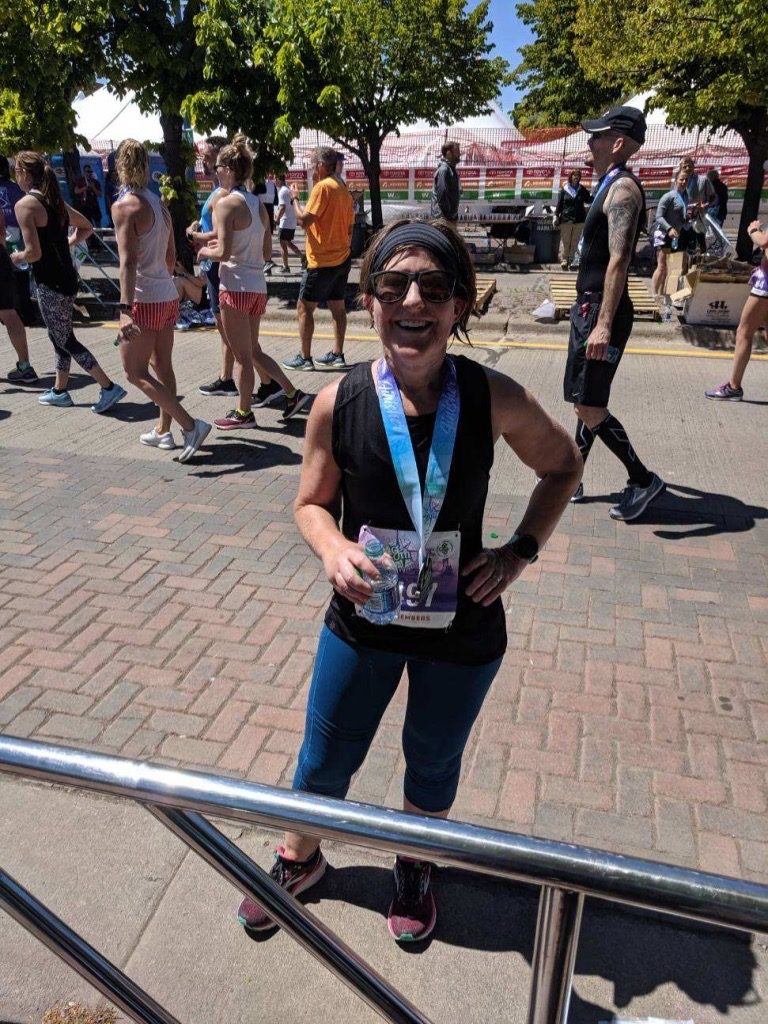 Yes! I remember hating the training process 20 years ago but I can honestly say I enjoyed it this time around. Being a more experienced runner along with having a good coach who understood my desires and created a personalized training plan for me made a world of difference. Better training equipment (Garmin watch!), better clothing options (a lot less chafing this time around) and being older (totally OK now with staying in Friday nights before long runs and likely also Saturdays after a long run ☺) also didn’t hurt. I tried to enjoy and take in more of the sights and sounds of the race course this time. I’m not going to lie though, I did have a vision of crossing the finish line this time in a very euphoric state. That didn’t happen. I crossed feeling very sore and a little bummed. I’m proud of finishing but also still believe I was trained and ready to get 4:10. I know the stress reaction played a part but I also lost the mental battle.