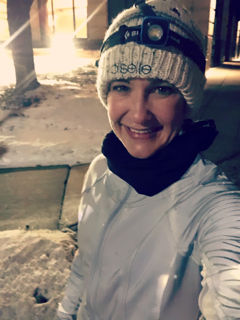 With temps in the teens, I wore Oiselle flyout tights, a Oiselle seamless long sleeve, a Oiselle flyte tank, with a reflective jacket on top. The jacket is my oldie-but-goodie Athleta Reflective jacket (read my original review HERE), which is seriously the brightest most reflective jacket ever! I also wore an old Oiselle beanie and Craft running gloves (their gloves are the best!) and a Black Diamond sprint headlamp (buy one here.)