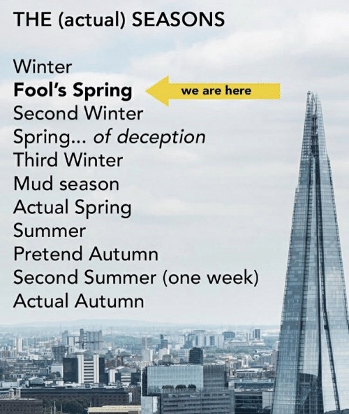 I’ve never heard of Fool’s Spring – that is so funny and so accurate.