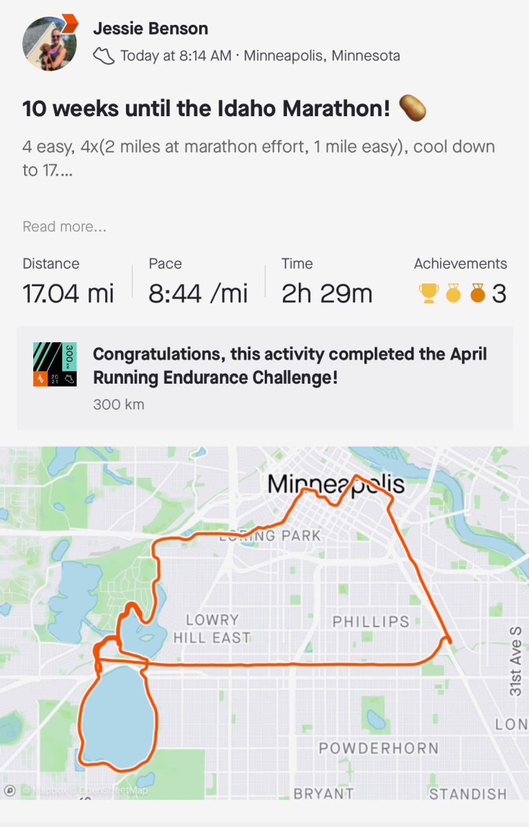 My workout was 4 miles easy, 4x(2 miles at marathon effort, 1 mile recovery), cool-down. 17 miles at an 8:44 min/mile average. I had company for the first 11 miles and then did the next 6 solo, which included 2 more sets of the 2 miles at marathon pace.