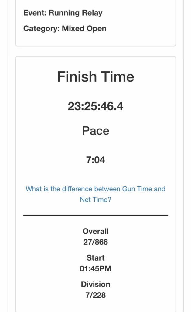 Wow, speedy pace for your team! Great job on the relay. I’ve never done one. I had a friend who was at that race and she posted a ton of pictures. It looked fun! I would be concerned about the lack of sleep for myself. I don’t sleep extra, but I don’t function well when tired!