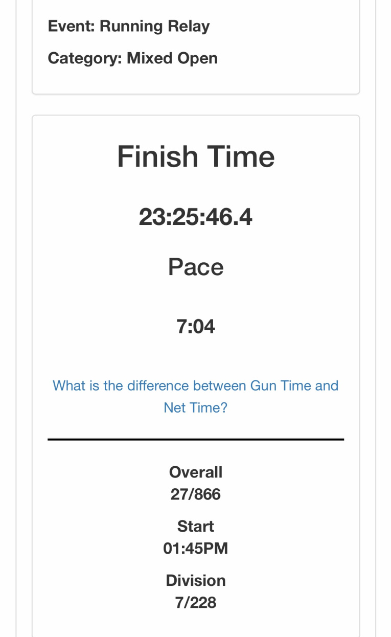 Our finish time was 23:25, or just at our expected average of 7:04 min/mile. 199 miles- done!