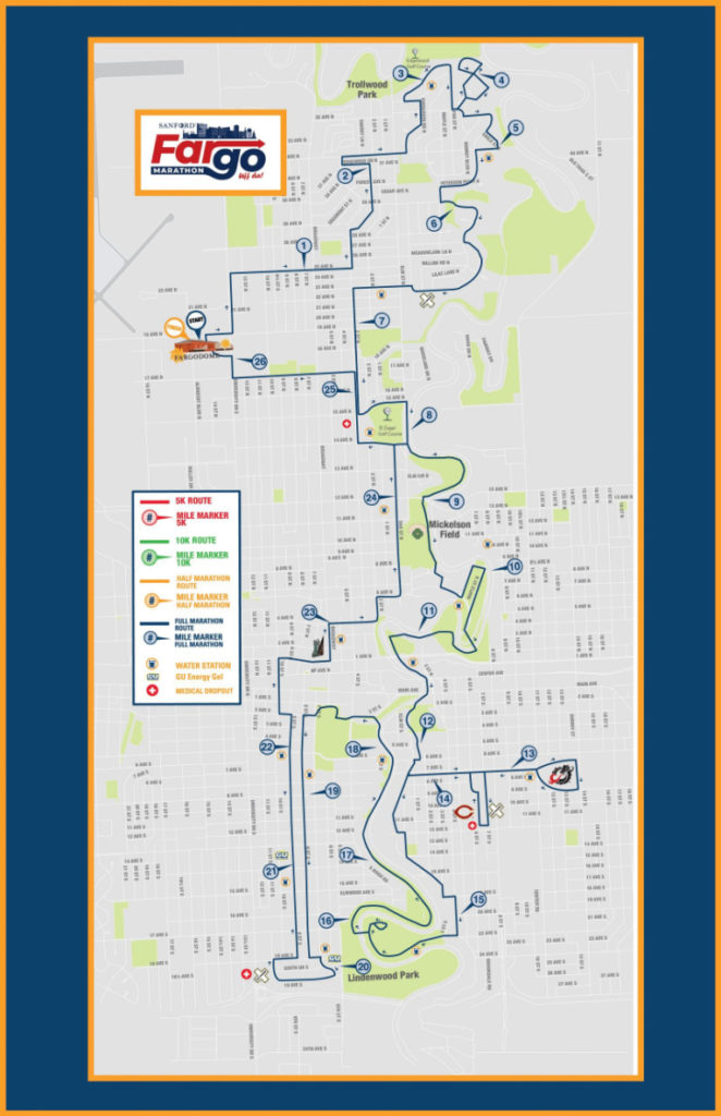 The aid stations were every two miles to start, with both water and Powerade, and then every mile in the final 10k. Great volunteers plenty of support. Great job Fargo!