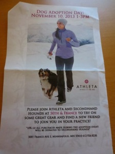 Even if you’re not looking for a furry companion at this time, you can still contribute by shopping! Go buy some Athleta stuff, and 10% of the sales from 1-3 pm on Saturday will be donated to Second Hand Hounds. Isn’t that great?
