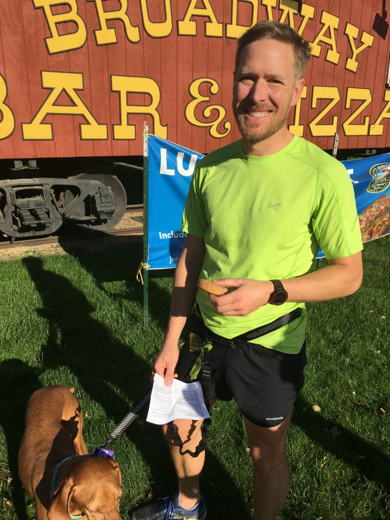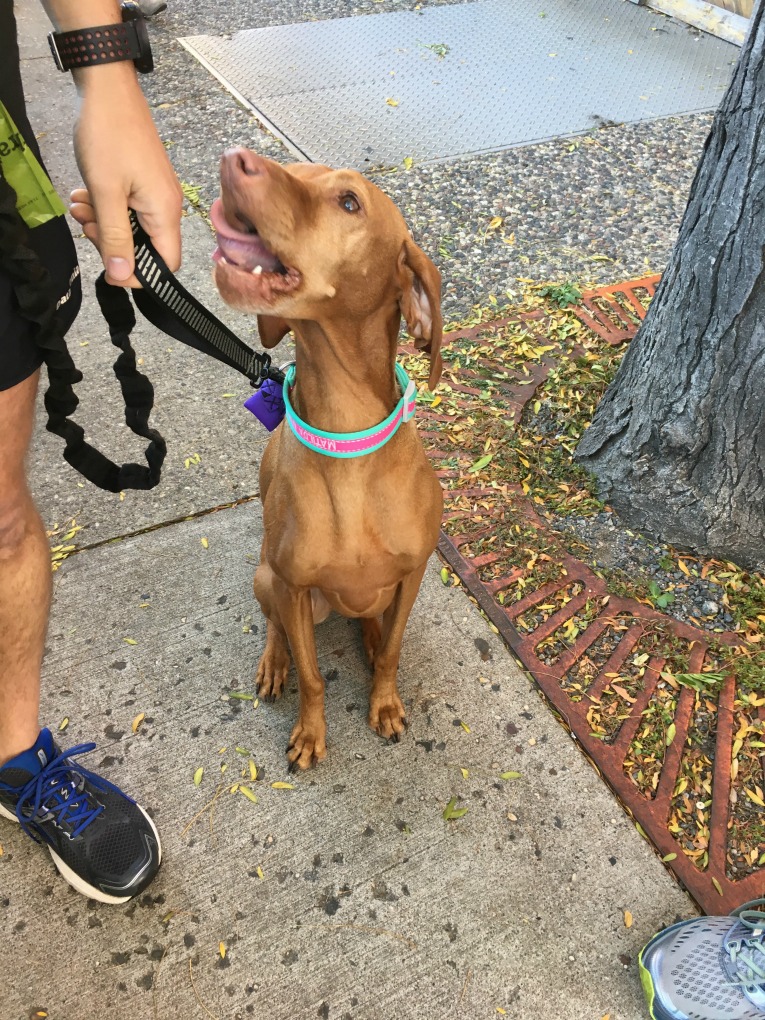 Tilda had no problem at all with the ‘close to 8 min/mile’ pace. At each stop, we’d give her a cup of water. No donuts though. She really wanted one!