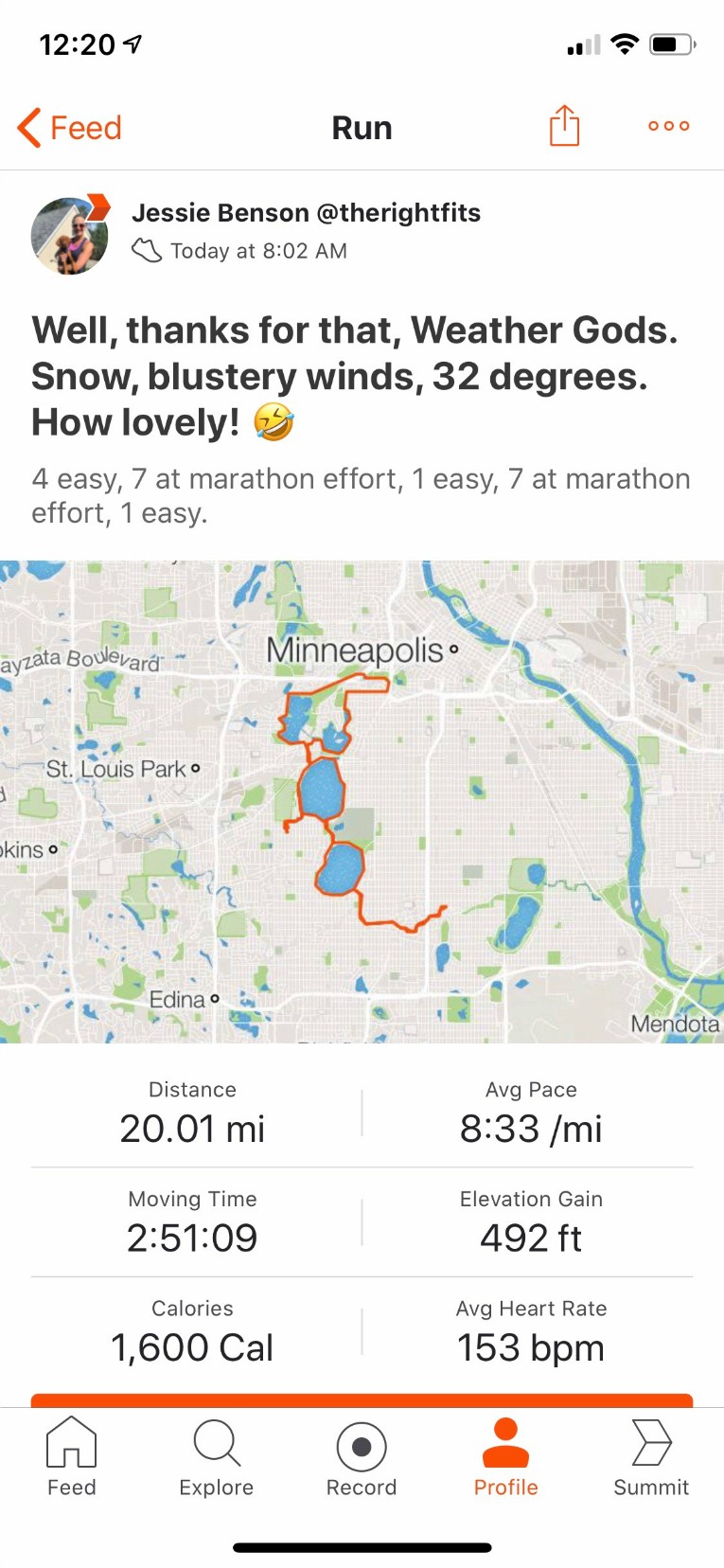 This was my third 20 miler of the cycle and even though the weather was challenging, it actually felt decent. Sure, there were some marathon-paced miles where the wind was blowing so strongly right into my face (I did not hit my goal on those miles!) but generally I felt okay, though it did take a lot out of me- I was beat afterwards.