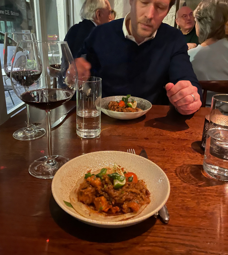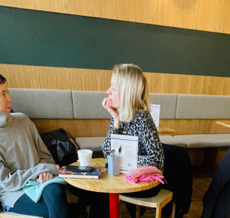 Later that day we took a coffee break and walked to Redemption Roasters down the road; Dustin waited outside with the dogs (even though it is dog-friendly, wrangling both of them in a crowd can sometimes be tough!) While inside, I recognized Anne-Marie Duff at a nearby table. I recognized her from Bad Sisters on HBO (great show!) but she was also on the British version of Shameless and others. This was my second celebrity sighting in Hampstead (the first was Ricky Gervais on a run with Ruth through the Heath.) I know, I should have probably said hello vs. taken this incognito photo…next time.
